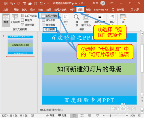 选择“视图”选项卡,单击“母版视图”中的“幻灯片母版”选项。