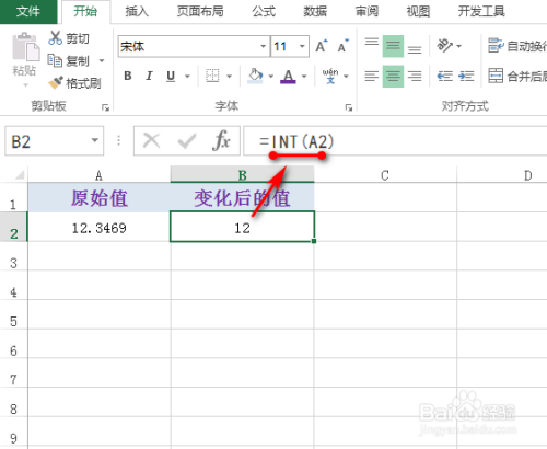 选中一单位格,然后输入公式:=INT(A2),接着按下Enter键,就能获得成果值,具体如图所示: