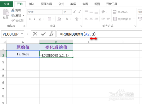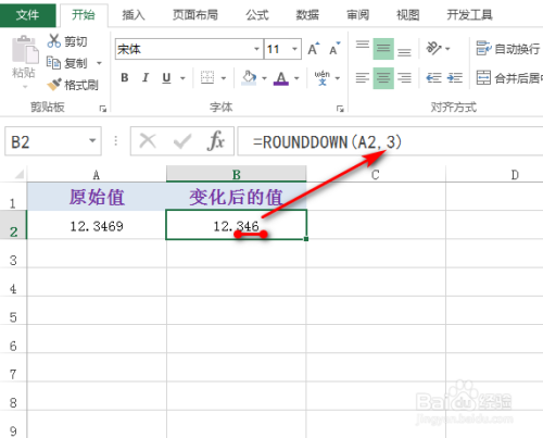 选中一单位格,然后输入公式:=ROUNDDOWN(A2,3),具体如图所示: