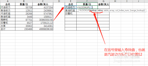 这里因为我们需要找到汽油动力的数目,那么查找值就是汽油动力,输入汽油动力地点单位格的位置E2,并在后面输入一个逗号,第一步就完当作了。