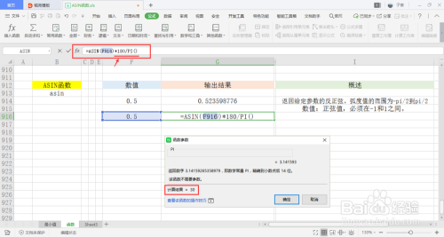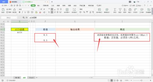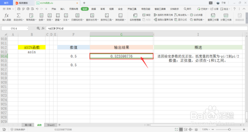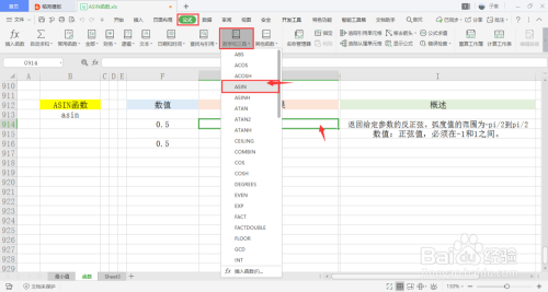 选中一个单位格用于存放输出成果,在菜单栏的公式下,打开数学和三角下拉框,点击此中的ASIN函数。