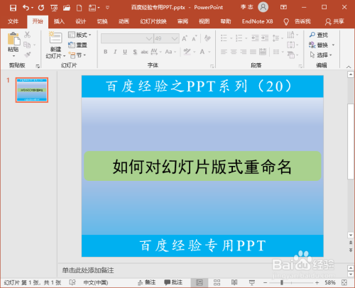 以Office 2019为例,打开演示文稿,需要注重的是这里点窜的母版和版式的名称只对当前的演示文稿有用。