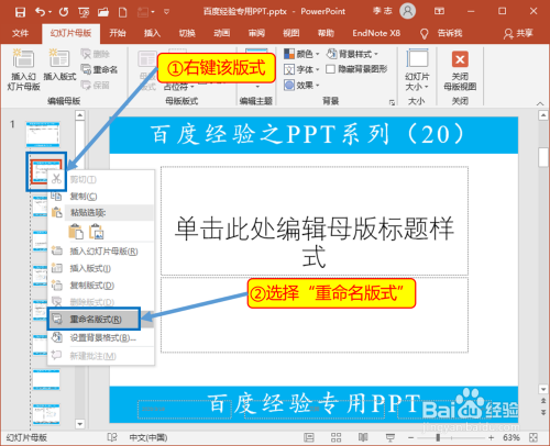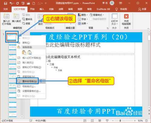 在新打开的“幻灯片母版”选项卡中,左边列出的就是母版和各个版式,最上边的是本家儿版式,右键可以对母版重定名。