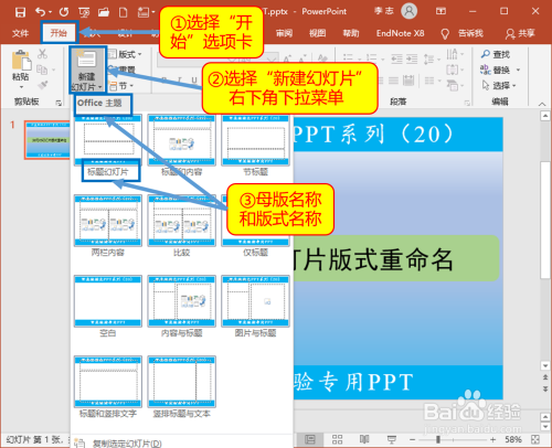 选择“起头”选项卡,点开“新建幻灯片”右下角的下拉菜单,可以看到母版和各个版式都有一个名称。下面看一下如何点窜。