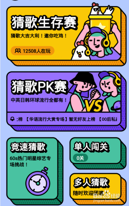 第一:登录【猜歌星球】在本家儿界面有五种模式进口。