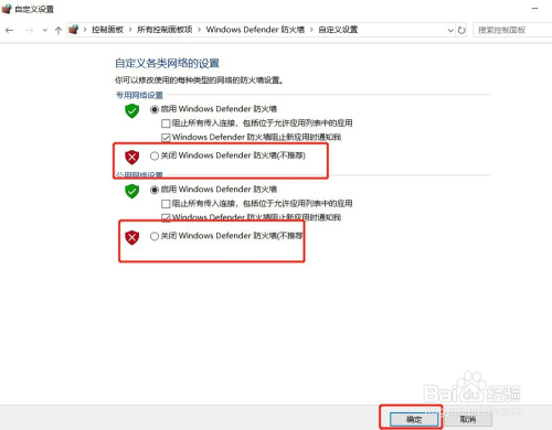 在专用收集设置和公用收集设置里面选择【封闭Windows Defender防火墙】,点击【确定】