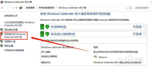 在防火墙界面,点击左侧的【启用或封闭Windows Defender防火墙】