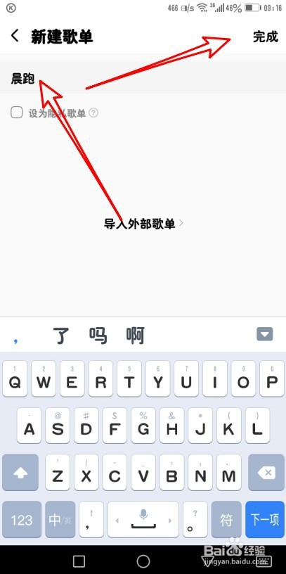 在打开的新建歌单页面,我们输入歌单的名称后,点击右上角的完成按钮。
