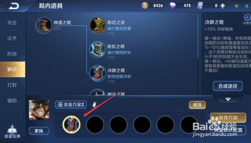 第一件装备我们选择“沉着之靴”,在供给移速的同时可以削减技术冷却时候。