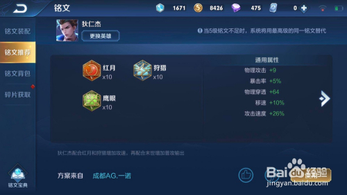 首先,我们铭文装配选择:红月*10,打猎*10,鹰眼*10,这样前期可以有足够移速和攻速加当作,