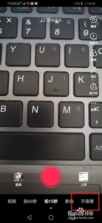 第一步手机上打开抖音,进去拍视频界面,点击开直播,如下图所示: