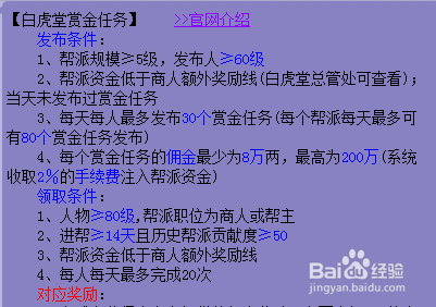 让我们先来看一下发布赏格使命有没有什么要求呢?当然有:1.品级要大于60级,自家帮派仍是5级以上的:2.帮派资金不低于商人额外奖励线:3.每人天天最多30次:4.佣金起码8万两最高200万。