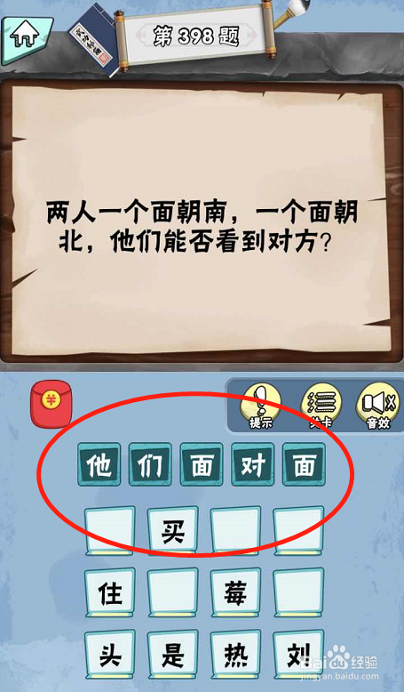 在脑子急转弯达人Lv4科学怪人第398关内,两小我一个面朝南,一个面朝海说神聊的话,他们可以或许看到对方。