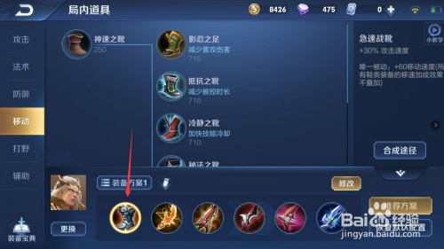 然后我们第一件选择“急速战靴”,不仅可以供给移速还可以供给攻速。