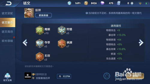 首先,为了包管前期发育,铭文选择:鹰眼*10,打猎*5,夺萃*5,祸源*7,无双*3.