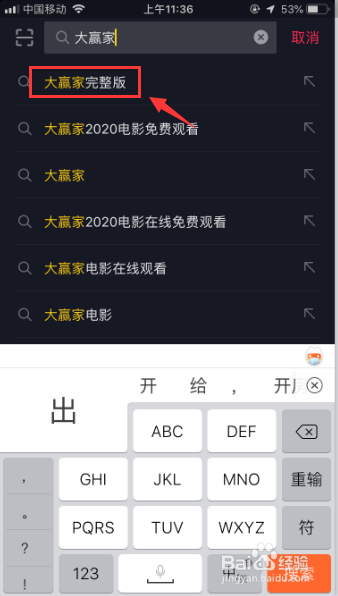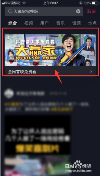 在搜索框中输入“大赢家完整版”并进入,呈现的“抖音请大师免费看”成果时,继续点击进入。