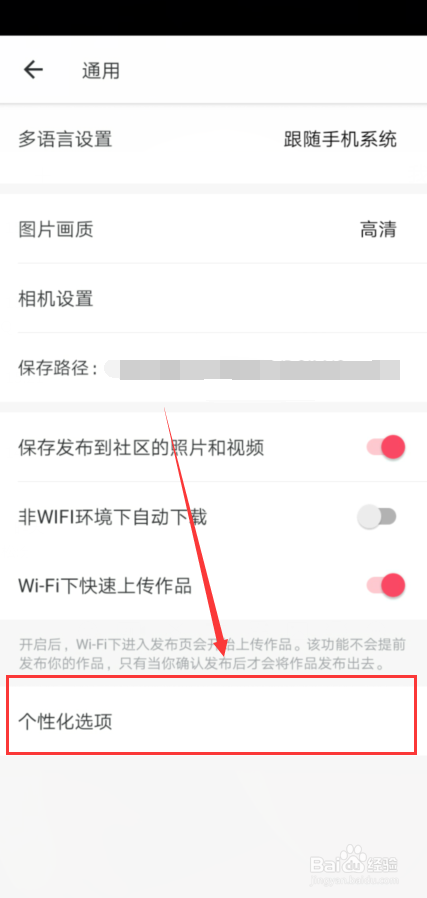 第五步,点开【通用】后,您会看到最下面就是【个性化选项】,点击它。