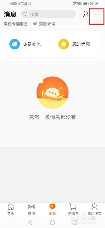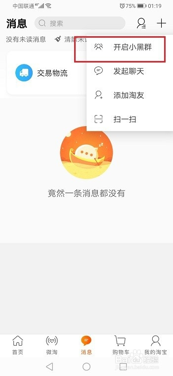 第一步淘宝小黑群是一个在群内采办分享的物品,获得红包的群,下面来开启小黑群,打开淘宝,进去动静界面,点击+,如下图所示: