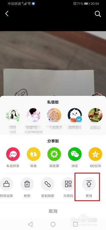 第四步滑动之后,点击置顶,进行置顶视频,如下图所示: