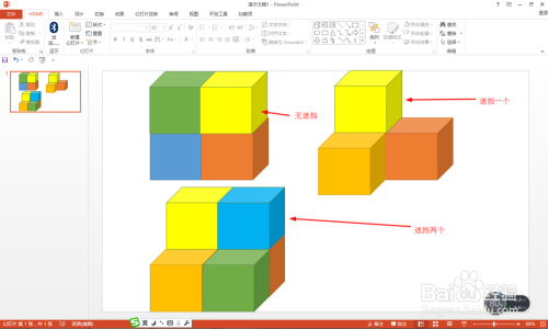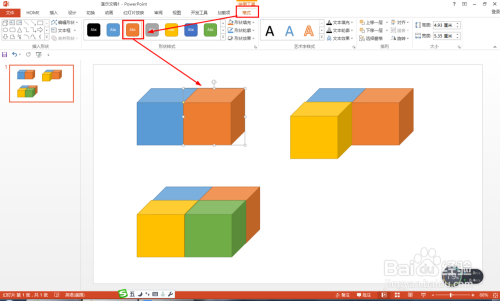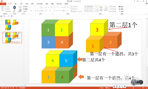 按住Ctrl键拖动复制,在统一层面添加第二、第三和第四个——点击格局——外形样式,选择分歧的颜色。经由过程颜色学生很轻易分辩有几多个正方体。