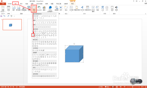 打开PPT2013,直接点击插入——外形——选择正方体,插入一个正方体。