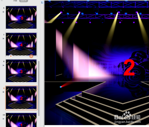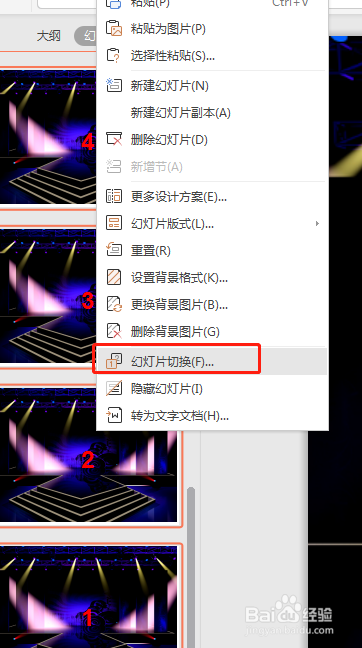 【设置幻灯片切换】:选中所有倒数页数,右击选择幻灯片切换。