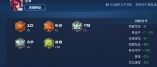 铭文:铭文携带7个夺萃3个打猎(有11.2%的吸血),绿色用鹰眼铭文、红色用7个祸源3个无双