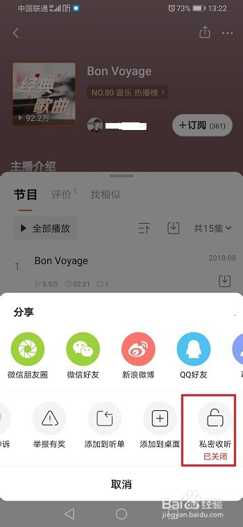第五步开启私密收听之后,订阅和收听的记实将不会被公开,如下图所示: