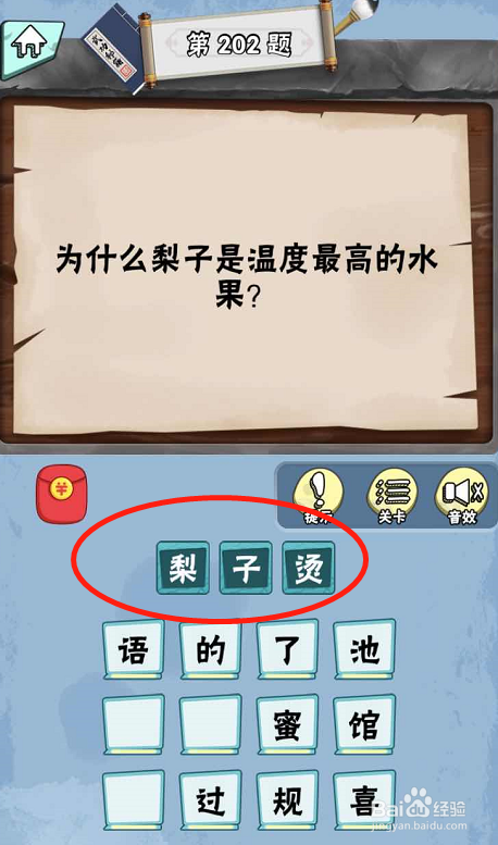 在脑子急转弯达人Lv5诺奖得本家儿第202关内,提问为什么梨子是温度最高的生果。准确谜底是“梨子烫”,因为有一种烫头的体例是离子烫,而“离子”和“梨子”是一个音,所以梨子是最唐烫的生果了。