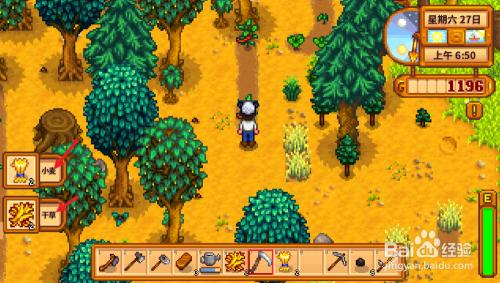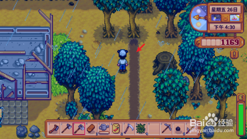 接下来就是【种辣椒】,在农场清理出一块空位,再用【锄】头挖一条坑,再把【辣椒种子】放下去种下。