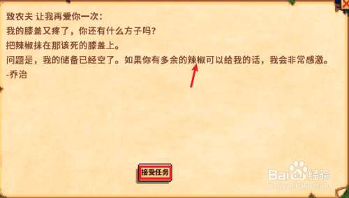 然后把辣椒当当作【礼品】送给他,【好感度】增添,同时完当作了二个使命,【膝盖疗养】和【结交指南】。