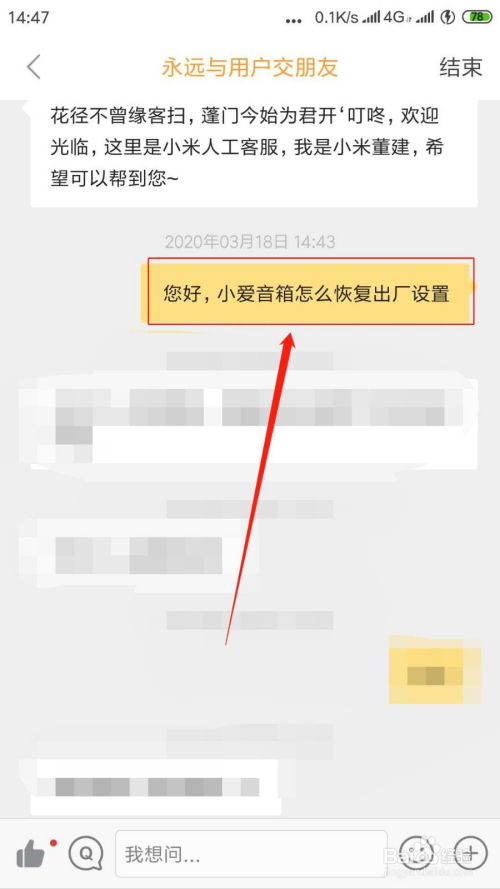 7.进入页面,在对话框输入“小爱音箱怎么恢复出厂设置”期待客服答复信息。