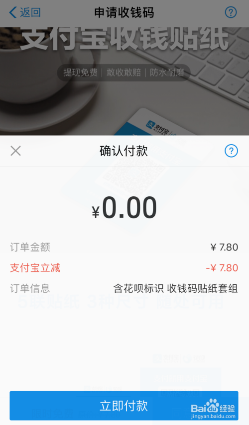 1.支付宝为您寄送收条目码贴纸,贴在收银处;