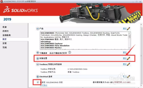 10、点击【更改】更改软件的安装路径,再点击【浏览】选择软件的安装目次,建议安装在除C盘之外的其他磁盘,可以在D盘或其他盘新建一个【SOLIDWORKS】文件夹,然后点击【返回摘要】。