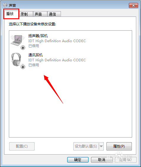 随后打开的播放声音设备中,若是显示下图这种有个黑色小箭头的图标,暗示您把当前的设备给禁用了。选择设备右键--启用即可