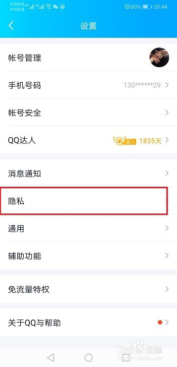第二步进去qq设置之后,点击隐私,如下图所示: