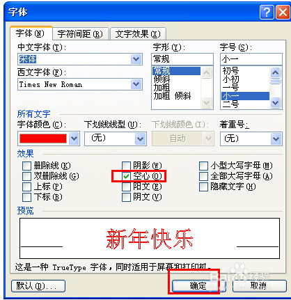 3.设置好颜色之后,勾选文字结果选择—“空心” ,点击确定即可,确定之后,再次查看文字结果已经酿成 空心的了。