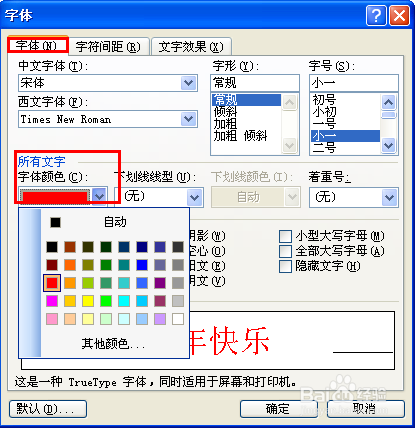 在呈现的字体选项卡里面,选择“常规”,按照本身的爱好选择一个颜色,(为什么要设置颜色呢?若是没有颜色空心字是看不出结果的哈)