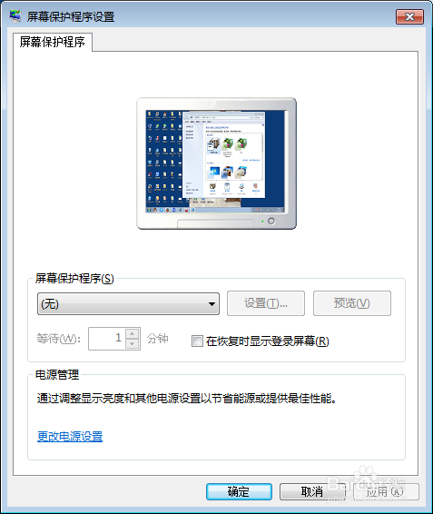 设置选择屏幕庇护程序为无,也就是不需要账号密码或不消比及鼠标不会进入屏幕庇护界面