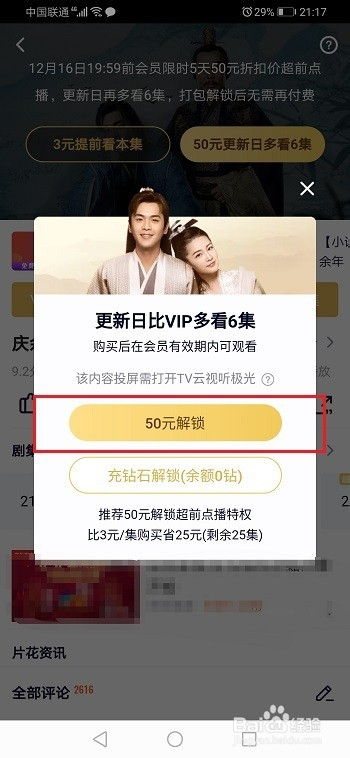 第五步也可以经由过程话费50元,每次更新多看6集,按照需要利用超前点播,若是不想付费的话,就多等一周就可以了,如下图所示: