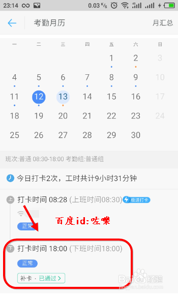 再次返回查看之前的考勤工作日历,如图可以查看到当前补卡 记实