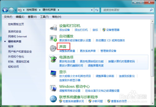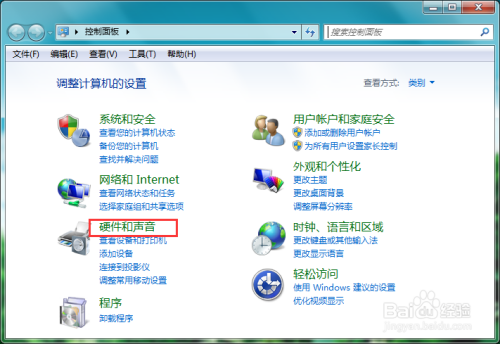 进入节制面板页面,右上角查看体例选择类别,在页面下方找到硬件和声音,打开