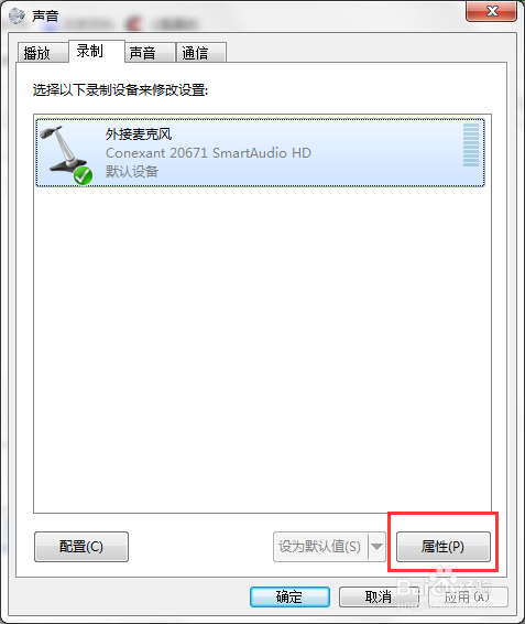在录制页面窗口中,点击选中外接麦克风,然后点击右下角的属性