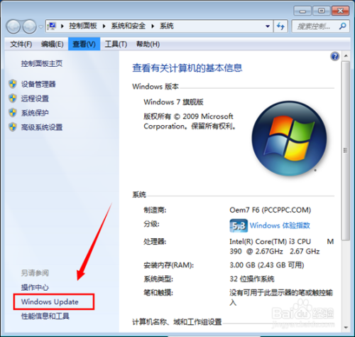呈现的win7计较机系统设置中,右下角有一个“windows update”功能,如箭头位置