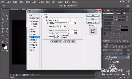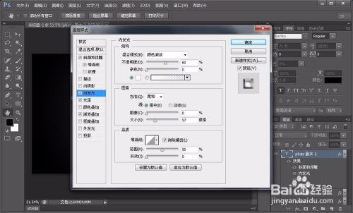 再复制一层图层,同样右击断根图层样式,然后添加斜面浮雕,内暗影,描边,具体参数如图,设置好参数之后,点确定,同样把填充度调为0%,如图: