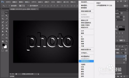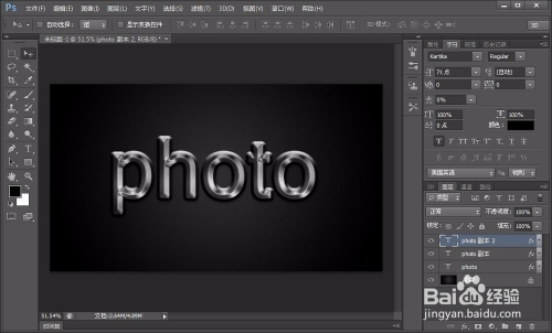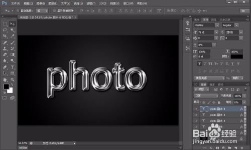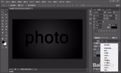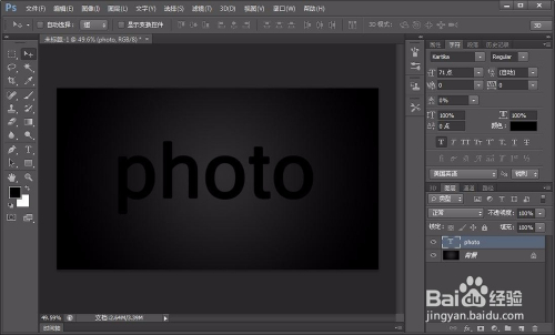 接着我们选择文字东西,在图层上打上photo,当然内容也是随意的,看本身的喜好,尽量找点粗点的字体,这样做起来更直不雅,如图: