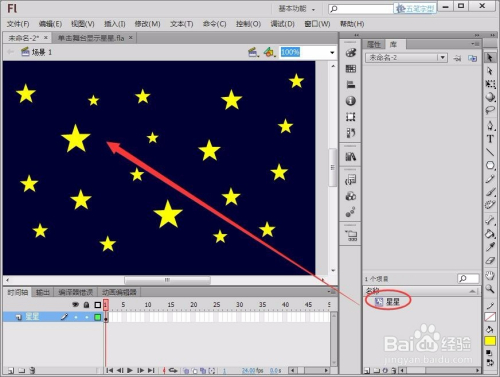 回到场景1,将“库”面板中的“星星”元件拖动到舞台中。