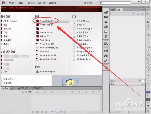 打开Flash软件,选择“ActionScript3.0”选项,新建一个空白文档。