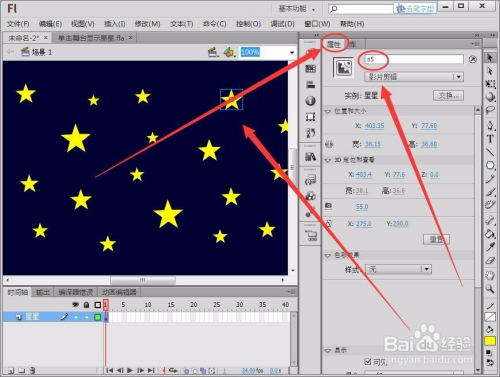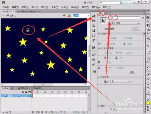 选中一颗星星,在“属性”面板中将“实例名称”取名为“s1“。