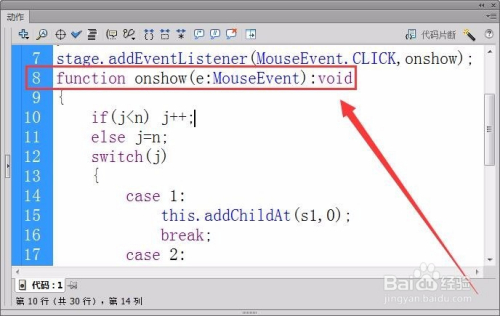 接着,定义舞台上鼠标单击事件的侦听器,接收者函数为onshow。
